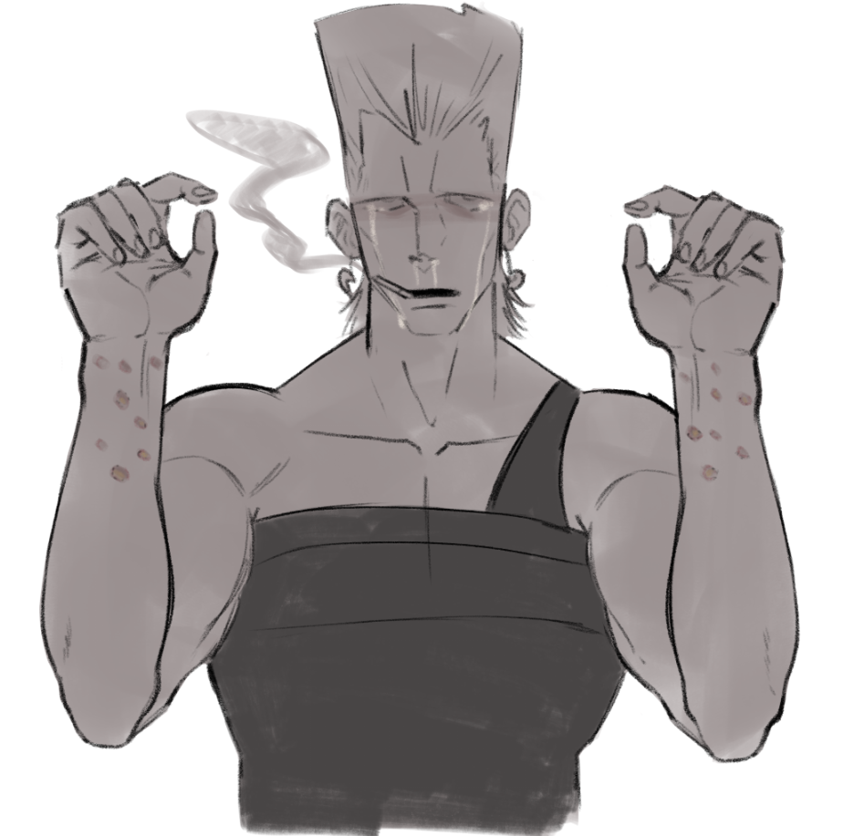Random hc that Pol used cigarettes to burn himself after his sister's death and that he hides the scars under his wristbands. I doubt he'd know exactly what sh is but still would never show those scars, and if found - he'd just brush it off ass "I needed something to shake me out of my thoughts haha, like a slap on the face nothing much!!". I mean bro was ready to die like 3 times already, he's not alright. Also I've been reading Stardust manga recently and got to that scene where Kakyoin cut "baby stand" on his arm, and I liked Polnareff's reaction there more than in anime: in the anime (at least it was dubbed like that) he exclaimed smth like "r u crazy?", while in manga he was just horrified and only said "oh... no..". I REFUSE TO BELIVE THAT HE'S THAT DUMB.